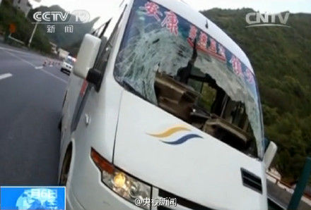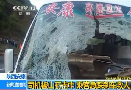 最近,陕西一辆客车行驶到包茂高速安康一路段时,突然被山顶一块重200余斤的落石击中前挡风玻璃,司机当场不幸身亡。就在车辆失去控制的危急时刻,车内一个姓冯的小伙及时冲到驾驶台,踩住了刹车,挽救了一车人的生命。为小伙子点[赞]